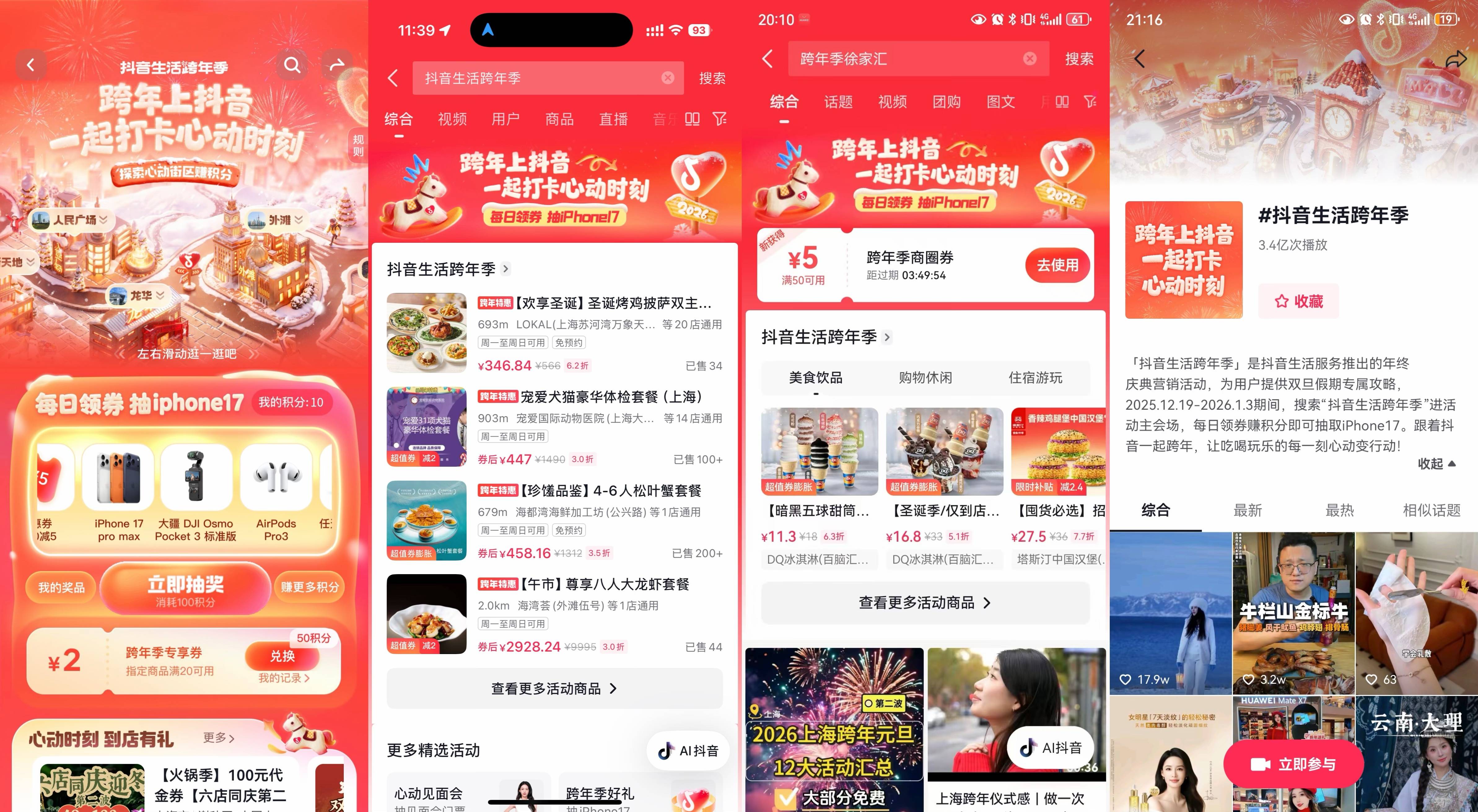 从抖音平台进入「抖音生活跨年季」主会场,完成任务解锁积分,跨年好礼天天抽不停!抖音搜索“新天地”、“外滩”、“徐家汇红包”、“龙华红包”等商圈相关信息,“5元立减券”即刻到手,直接叠加商家团购商品~“低至2折的圣诞烤鸡套餐”、“3折的宠物健康体检礼遇”、“亲友聚会松叶蟹”,还有“百元火锅代金券”等多款诚意跨年套餐现已上线,涵盖餐饮、逛街购物、亲子宠物等多元场景,一站式满足在上海跨年的消费需求。活动期间,「抖音生活跨年季」话题总播放量超过3.4亿,上海五大商圈交易总量同步提升30%,4个热点登上同城热榜总曝光超2000万。